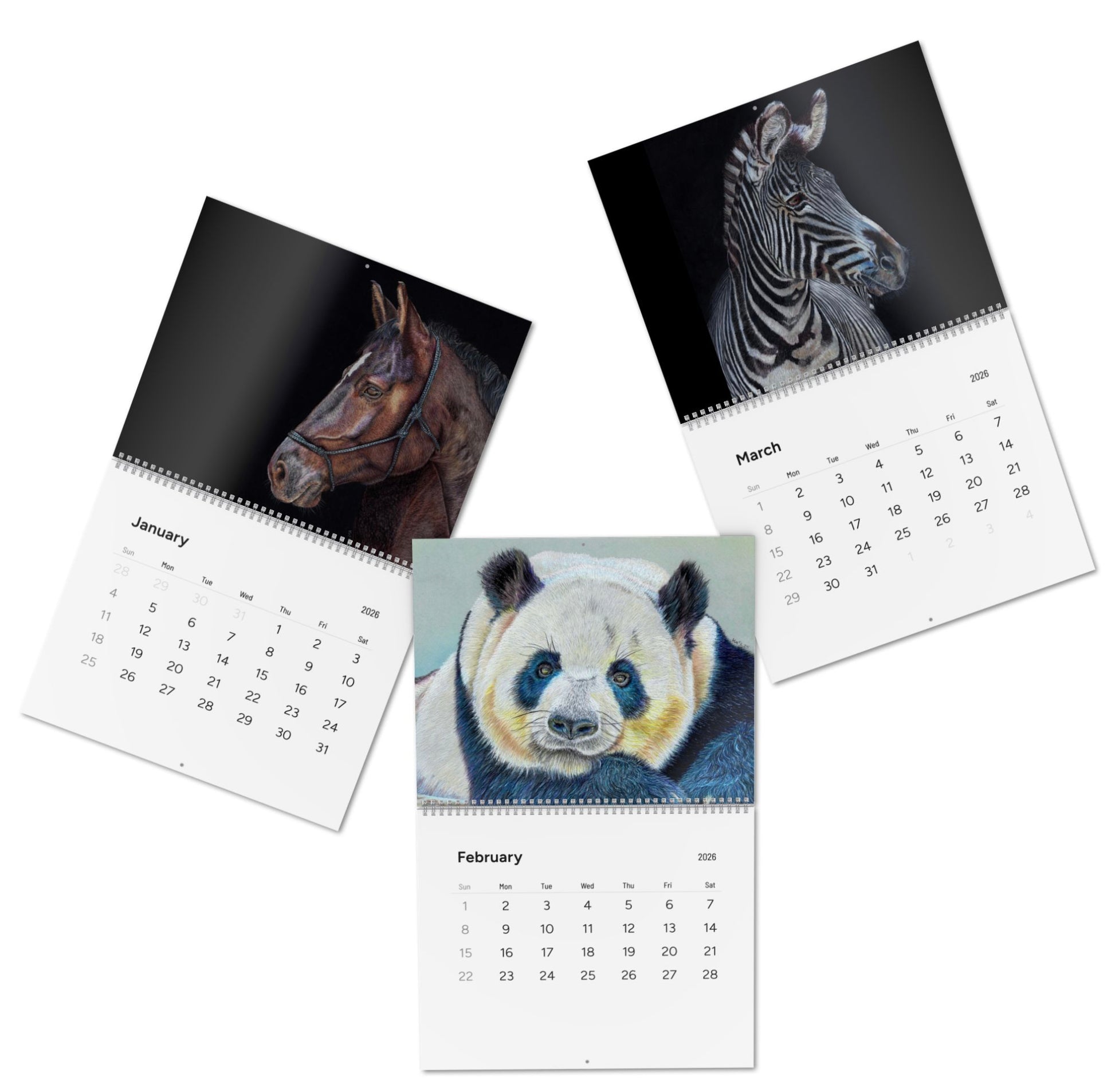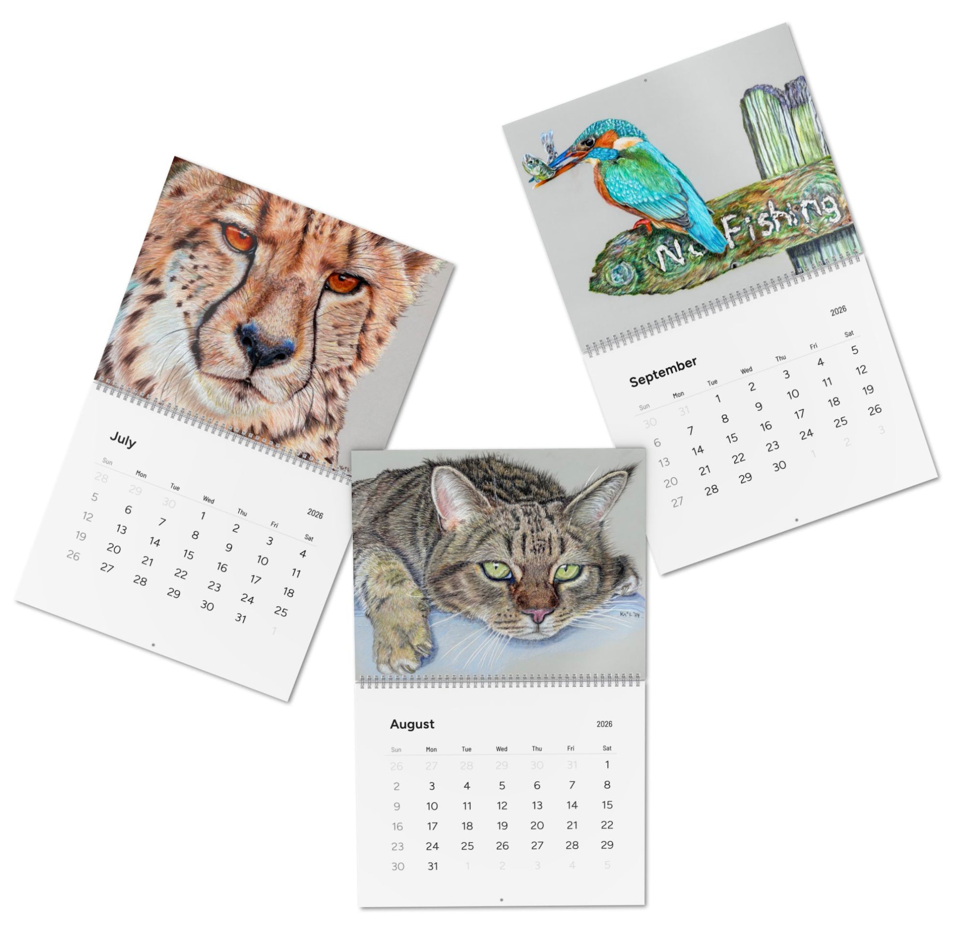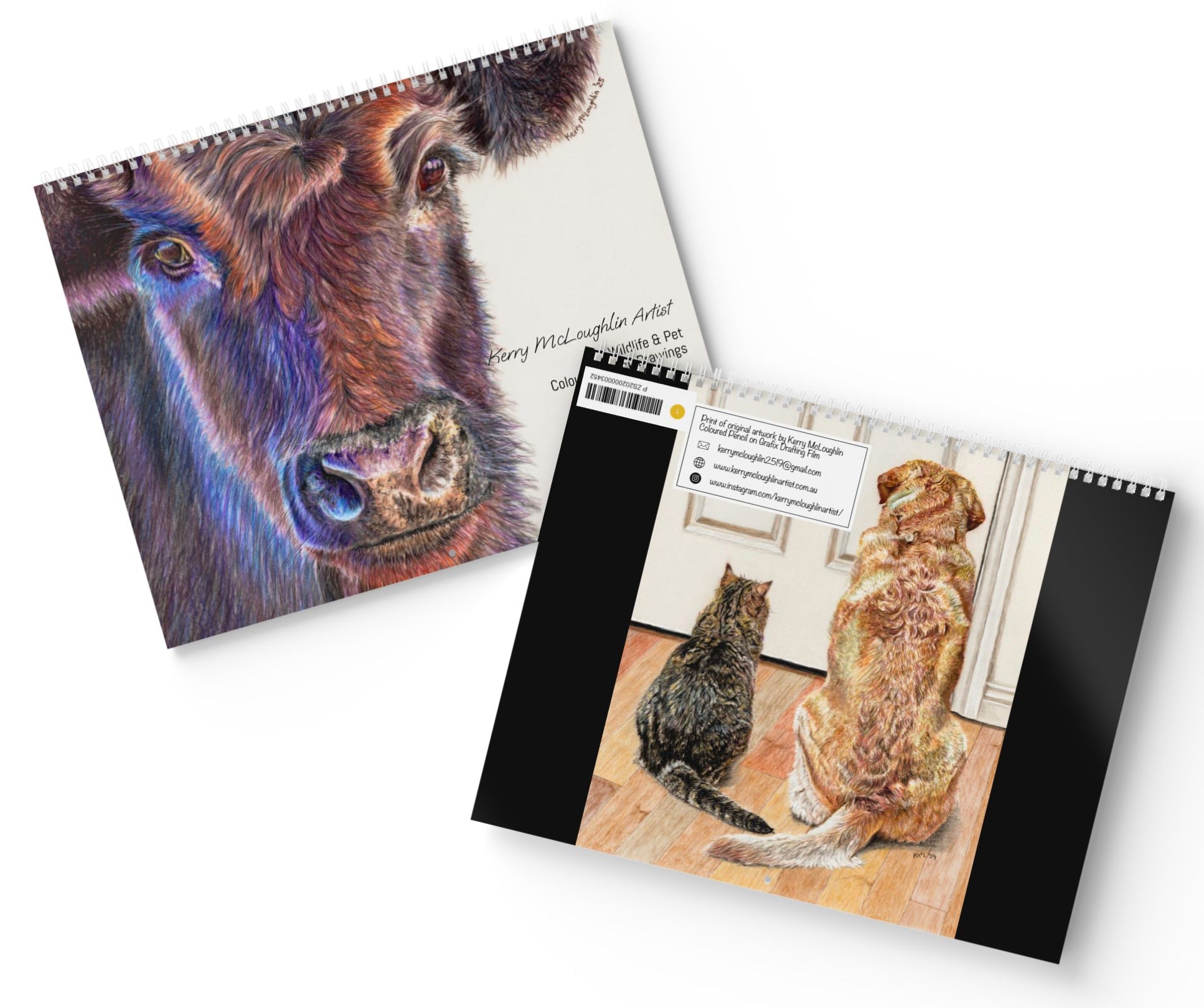 Limited Edition 2026 Art Calendar, featuring 12 of Kerry McLoughlin’s much-loved coloured pencil drawings of pets and wildlife, each doubling as collectible pieces of art. The calendar artwork is printed on 250gsm premium-quality paper stock in matte finish, allowing writability with a pen or permanent marker for scheduling without smudging. It features spiral binding on the top for seamless switching between the pages, with a centred hole for hanging, and measures 13.7 inches (34.8cm) by 11 inches (27.9cm).