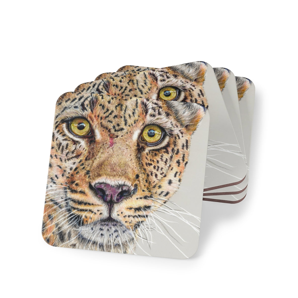 Set of 4 matching square coasters, each 9.5 × 9.5 cm with vibrant artwork printed on a glossy hardboard top. The corkwood base keeps surfaces scratch-free and slip-resistant. Stylish, practical, and easy to clean – just wipe with a dry microfibre cloth.