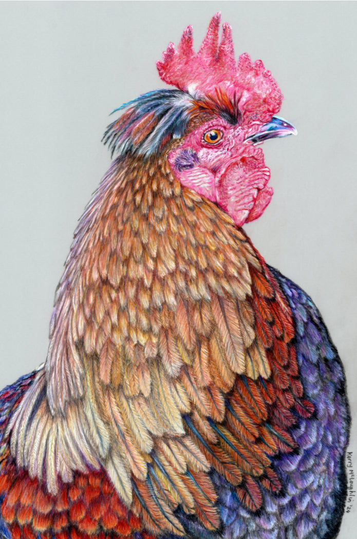 I loved the different textures depicted in this rooster (the smoothness of his beak, floppiness of his crest, and featheriness of his body), and the richness of colours throughout.
