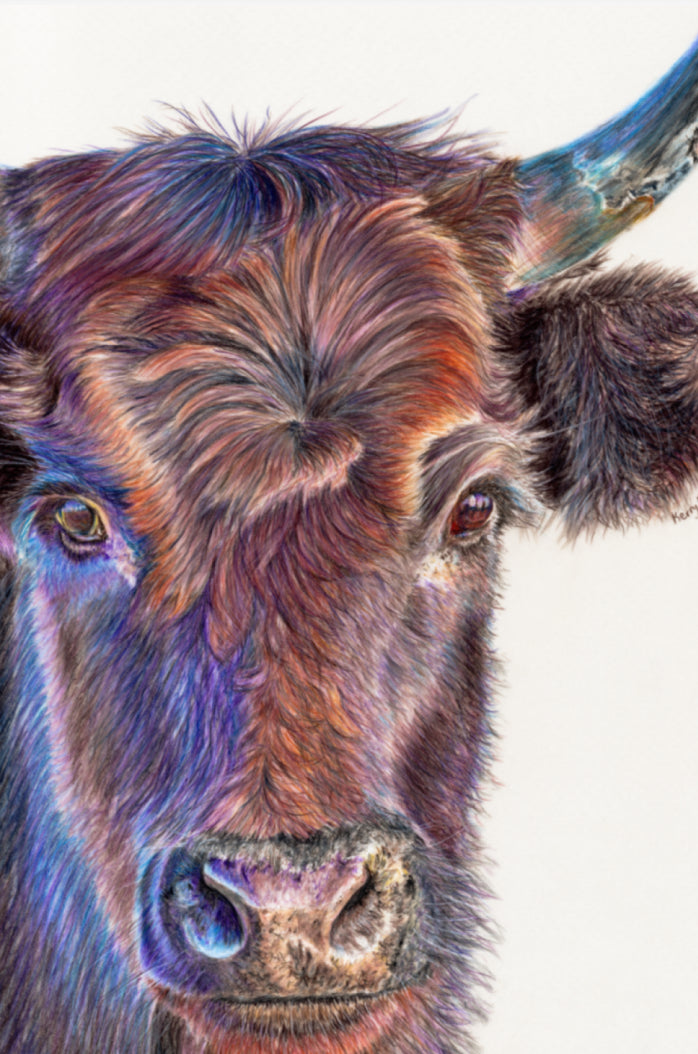 In this graceful brown cow drawing, I admired all the deep purples and blues seen in her shadowed fur, and the beautiful reddy-oranges in the sunkissed fur. I loved the interesting textures and colours in her horns and her gentle soulful eyes. I hope you are moooved by her too.