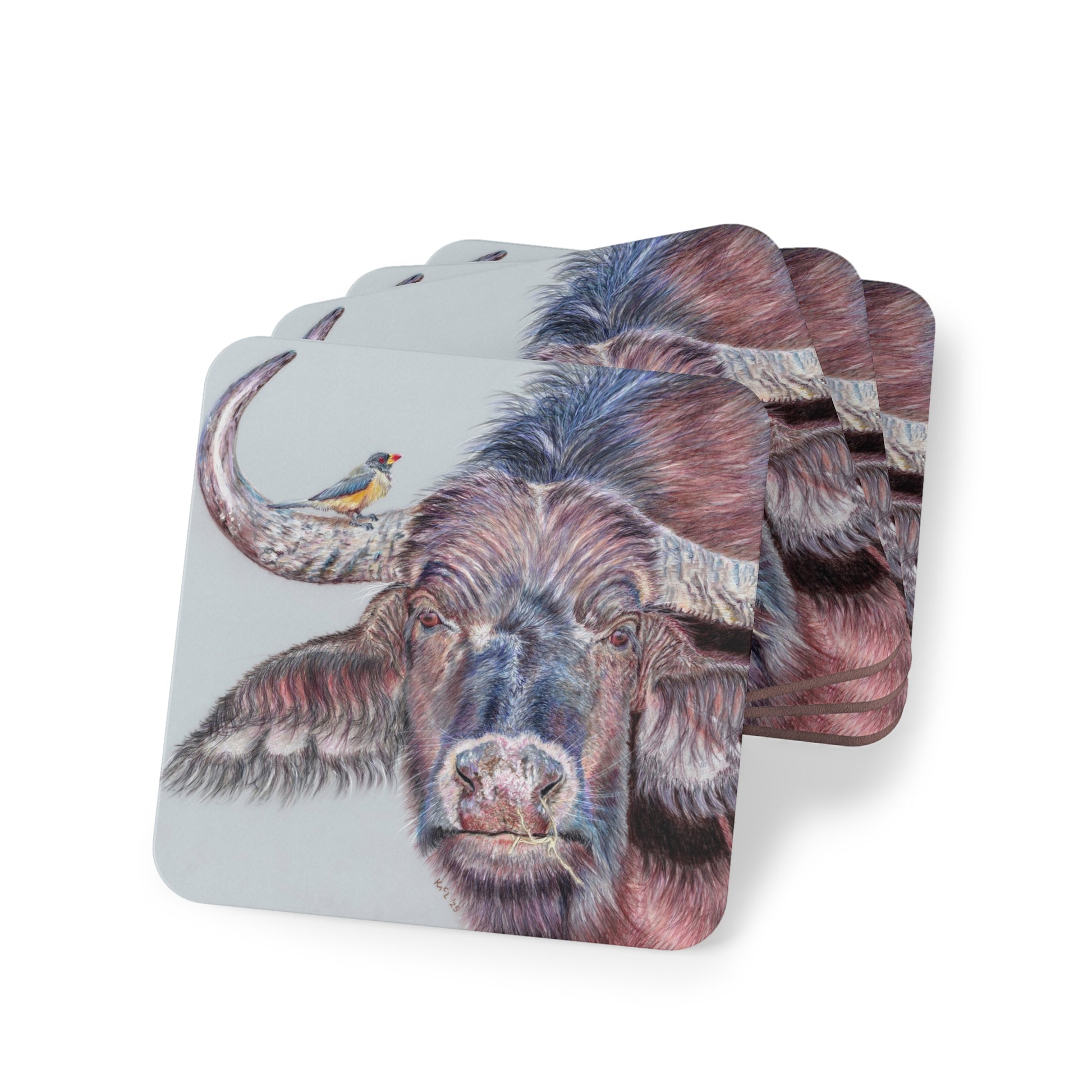 Set of 4 matching square coasters, each 9.5 × 9.5 cm with vibrant artwork printed on a glossy hardboard top. The corkwood base keeps surfaces scratch-free and slip-resistant. Stylish, practical, and easy to clean – just wipe with a dry microfibre cloth.