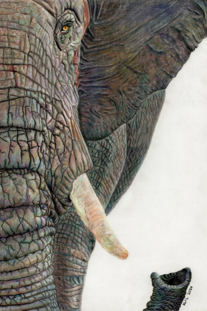 Elephants are such amazing and unique creatures, with strong family ties, excellent memory and intelligence, infrasonic and seismic communication, apparent self-awareness and are beautiful to look at. I wanted to draw an African Elephant, from my birth country, and to find an interesting angle to draw, including the notable trunk, tusk and ear, necessitating the sacrifice of a prominent detailed eye for the size scale required.