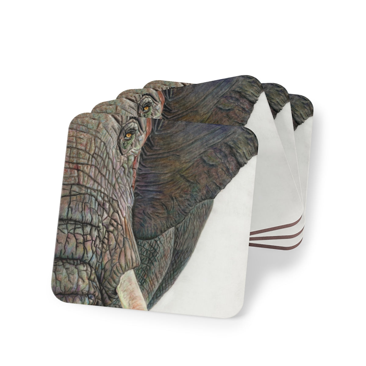 Set of 4 matching square coasters, each 9.5 × 9.5 cm with vibrant artwork printed on a glossy hardboard top. The corkwood base keeps surfaces scratch-free and slip-resistant. Stylish, practical, and easy to clean – just wipe with a dry microfibre cloth.