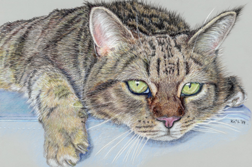“Milky” is our gorgeous and very friendly tabby cat. I am always drawn to the colour, richness and intensity of animal eyes, which can show such emotion. I found this pose appealing, especially with her claws showing through, and depicting her gentle nature and idle laziness, unphased by my paparazzi habits.