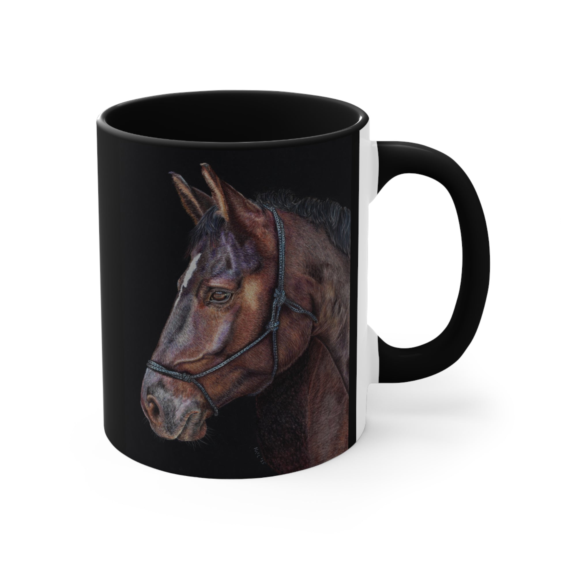 330ml white ceramic mug with a coloured interior and matching handle for a comfy, sturdy grip. Choose from four colours – black, blue, red or pink. This portrait artwork is featured in duplication on the left and right, with a black background between them. Microwave-safe, hand wash only.